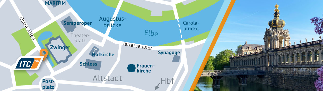 Die ITC AG befindet sich im Zentrum von Dresden – nahe Postplatz und gegenüber dem Dresdner Zwinger. Der Standort ist hervorragend erreichbar: per Bahn und ÖPNV, mit dem Auto sowie über den Flughafen Dresden. Parkmöglichkeiten stehen in der näheren Umgebung zur Verfügung.